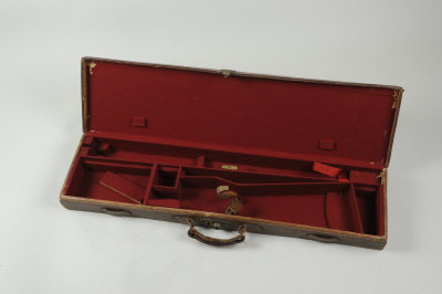 A LIGHTWEIGHT LEATHER GUN CASE with compartment for up to 30-inch barrels, suitable for a double-barrelled rifle |