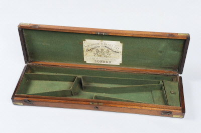 FREDERICK BARNES A BRASSBOUND MAHOGANY GUN CASE suitable for a percussion gun, compartment for 30-inch barrels |