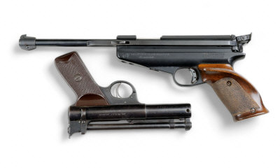 WEBLEY & SCOTT A .177 "SENIOR" MODEL PRE-WAR AIR PISTOL, S9708 6 1/2-inch barrel with stirrup catch, the frame with impressed patent dates and retaining much original finish, chequered composition grips; together with a Feinwerkbau .177 model 65 target air pistol; and a Walther CP88 CO2 pistol, no. A7198366 (3) S58 |