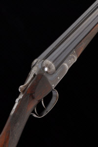 30-inch barrels with 2 1/2-inch chambers about 1/4 choke borings, cross bolt extension, the blued frame with fine scroll engraving and retaining some original finish, 15 1/4-inch figured stock including 1 1/2-inch extension, 6lb. 8oz., nitro proof, in its maker's leather case