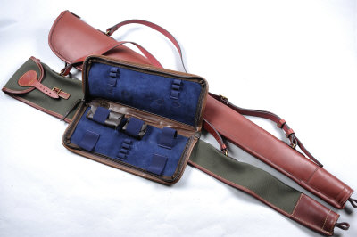 A LEATHER GUN SLIP the full length burgundy leather slip with fleece lining; together with a leather cleaning kit bag; and a green canvas slip (3) |