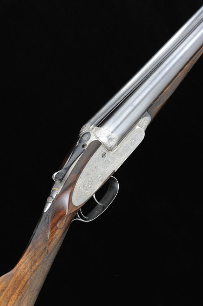 27-inch chopper-lump barrels with 2 1/2-inch chambers, about 1/4 and 3/4 choke borings, the frame, locks and top lever with fine bouquet and scroll engraving, lined cocking indicators, 14 1/2-inch well figured stock, 6lb. 4oz., nitro proof