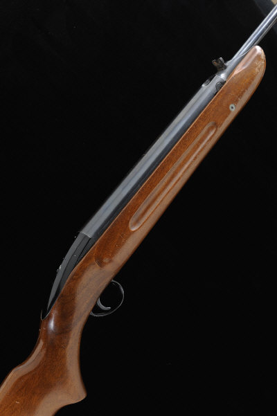 BSA A .22 "AIRSPORTER" MODEL AIR RIFLE, NO. GC2716 18-inch barrel with ramp fore sight and folding leaf sight, half length stock with pistol grip, 14-inch pull, 7lb. 6oz., stock split at the hand |