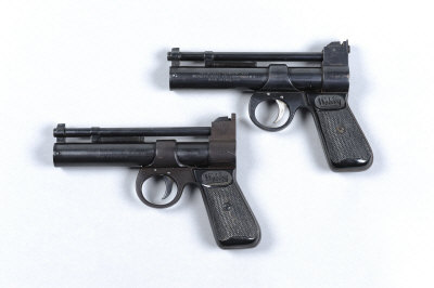 WEBLEY & SCOTT A .177 "JUNIOR" MODEL AIR PISTOL, NO. 1900 6-inch smoothbore barrel, chequered composition grips; together with another similar example, no. 015; and "The Briton" .177 air pistol; and three Diana type air pistols with push-in barrels (6) |