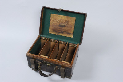 A BRASSBOUND LEATHER CARTRIDGE MAGAZINE for about 150 cases, with straps and dividers, Charles Boswell label |