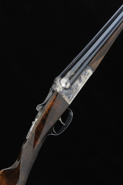 27-inch chopper-lump barrels with 2 3/4-inch chambers, about 1/2 and full choke borings, the frame and top lever with scroll engraving and retaining some original hardening colour, 15-inch figured stock, 5lb. 4oz., Spanish nitro proof