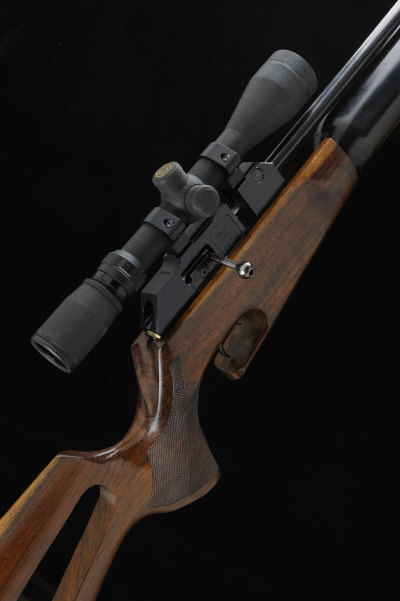 THEOBEN A .20 "RAPID" MODEL 12/200 PRE-CHARGED FAC AIR RIFLE, NO. 006797 21-inch barrel including sound moderator, detachable air bottle, the receiver with bolt-action and rotary magazine, mounted with a Simmons Whitetail Classic telescopic sight, the half length figured cut-away stock with pistol grip, cheekpiece and rubber recoil pad, 14 1/2-inch pull, 8lb. 4oz. S1 |