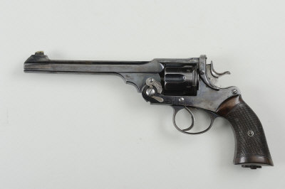 WEBLEY & SCOTT A .455 WG TARGET MODEL REVOLVER, NO. 18921 7 1/2-inch barrel, retaining some original finish overall, the frame with winged bullet trademark, the stirrup catch with adjustable rear sight, flared chequered walnut grips with lanyard loop, black powder proof S5 |