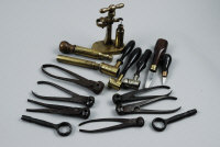 A GROUP OF GUNMAKERS ACCESSORIES comprising: 3 shot and powder measures; 6 small calibre pistol bullet moulds; 2 barrel keys; capper/decapper tool; small pistol turnscrew, etc; and two books, "Gun Tools, Vol 2" and "Small Arms" |