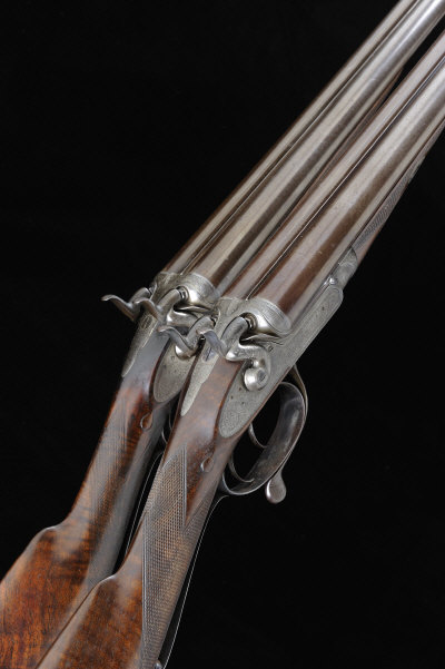 The maker confirms that gun no. 921 was originally built in 1849 as a muzzle-loading gun and that it was converted to breech loading centrefire by them in 1872. Gun no. 3736 was built to match and make a pair to the earlier gun in 1883 for J. E. Gladstone Esq. |