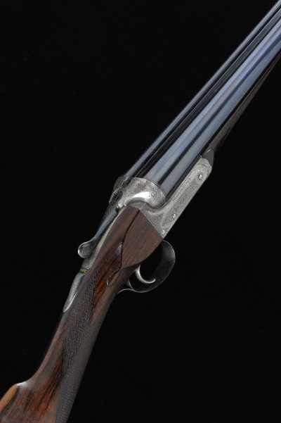 WILLIAM EVANS A 12-BORE SINGLE TRIGGER BOXLOCK EJECTOR GUN, NO. 11826 30-inch barrels with 2 1/2-inch chambers, about improved cylinder and 3/4 choke borings, doll's head extension, the frame and top lever with fine scroll engraving and retaining faint traces of original hardening colour, 13 3/4-inch well figured stock, 6lb. 8oz., nitro proof S2 |