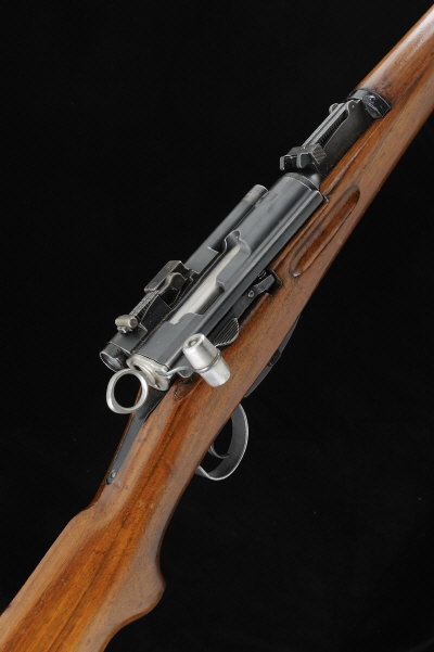 SCHMIDT RUBIN A SWISS 7.5X55MM MODEL KAR.31/43 STRAIGHT PULL SNIPER RIFLE, NO. 451088 25-inch barrel with adjustable fore sight, the tangent rear sight graduated to 15, the receiver fitted with its side mounted telescopic sight, detachable box magazine, bolt with straight pull, full length stock with hand guards and steel butt plate, 12 1/2-inch pull, 9lb. 14oz., nitro proof S1 |