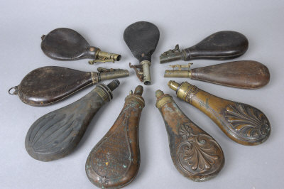A COLLECTION OF SHOT AND POWDER FLASKS comprising: 5 shot flasks and 4 powder flasks, various styles |