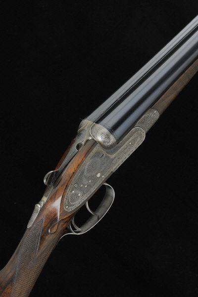 F. P. BAKER & CO. A 12-BORE SIDELOCK EJECTOR GUN, NO. 82163 28-inch barrels with 2 1/2-inch chambers, about true cylinder and 3/4 choke borings, mid extension, the frame, locks and top lever with bouquet and scroll engraving and retaining much original hardening colour, the maker's name signed within a scrolling banner, 14 3/4-inch well figured stock with ribbed butt plate, 6lb. 6oz., nitro re-proof S2 |