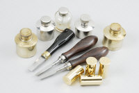A GROUP OF GUNMAKERS ACCESSORIES comprising: four oil bottles, two signed Rigby, two gold washed; two pairs of gold washed snap caps; glass oil bottle; a pair of turnscrews; and a further turnscrew signed Purdey |