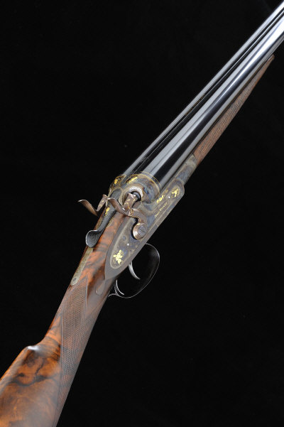 30-inch barrels with 2 1/2-inch chambers about full choke borings, the frame, rebounding bar locks, hammers and top levers profusely engraved with fine scrollwork, surrounding gold inlaid scrolls and rose bouquets, retaining all of its hardening colour, 14 3/4-inch highly figured stock with chequered butt, 7lb, nitro proof