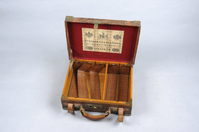 STEPHEN GRANT & SONS A BRASSBOUND OAK AND LEATHER CARTRIDGE MAGAZINE for about 350 cases, leather straps and one divider |