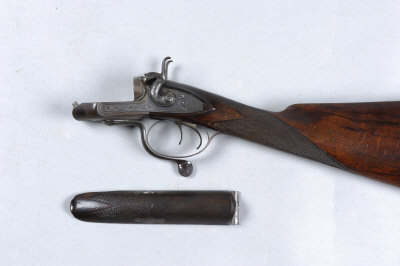 JOSEPH MANTON THE ACTION, STOCK AND FORE-END ONLY OF A 20-BORE HAMMER GUN, NO. 8225, CONVERTED FROM PERCUSSION the frame, non-rebounding bar locks, hammers and rotary underlever with border and scroll engraving and retaining some original hardening colour, 14 1/4-inch figured stock with steel butt plate S2 The gun was likely built circa 1818 as a patent pellet lock gun and was subsequently converted by W R Barratt of Burton-on-Trent using a typical shoe-lump conversion. |