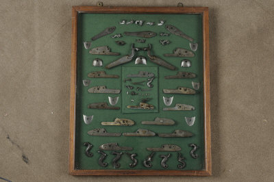 A FRAMED DISPLAY OF GUN LOCKS AND ASSOCIATED ITEMS including a pair signed by Trulock & Harris, many signed with associated parts, 19 1/2 by 24-inches |