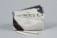 A TARTAN ENAMELLED SILVER PLACE FINDER converted from a card case, with eight bone pegs, engraved with an 'M' monogram |