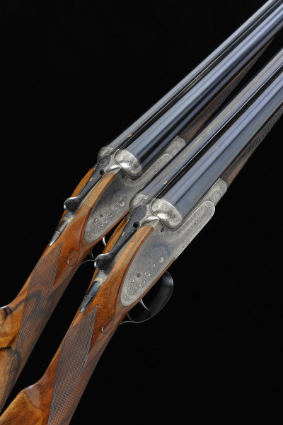 WILLIAM POWELL & SON A PAIR OF 12-BORE SINGLE TRIGGER SIDELOCK EJECTOR GUNS, NOS. 12995/6 29-inch chopper-lump barrels with 2 1/2-inch chambers, about 1/4 choke borings, doll's head extensions, the frames, locks and gold numbered top levers with fine bouquet and scroll engraving and retaining some original hardening colour, 15-inch well figured replacement stocks, 6lb. 8oz., nitro proof, in their maker's brassbound leather case S2 |