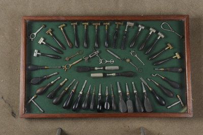 AN IMPRESSIVE FRAMED DISPLAY OF GUNMAKERS TOOLS including turnscrews, nipple keys, shot and powder measures, cartridge extractors, chamber brushes, etc, 32 by 19 1/2-inches |