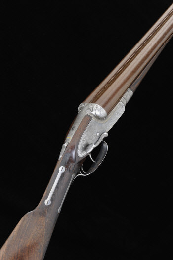 STEPHEN GRANT & SONS A 12-BORE SIDE LEVER SIDELOCK EJECTOR GUN, NO. 5940 30 1/4-inch lined damascus barrels with 2 1/2-inch chambers about 1/2 choke borings, the frame, locks and side lever with fine scroll engraving and retaining some original hardening colour, carved fences, 14 1/2-inch well figured stock with steel repair plates to hand, 6lb. 13oz., nitro re-proof