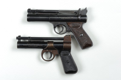 6 1/2-inch barrel, worn overall, left grip chipped, chisel damage to the end cap; together with a .177 "Junior" model air pistol, no. 1587 (2)