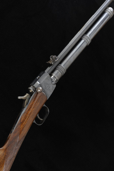 MANUFACTURE FRANCAISE A FINE 6MM GIFFARD CO2 AIR RIFLE, NO. 3426 25 1/2-inch barrel with adjustable rear sight, the breech engraved with scrolling foliage and Montgolfier balloon trademark, loading tap, the screw-mounted gas cylinder with gnurled grip, 13 1/2-inch figured stock with maker's butt plate and retaining much of its original finish overall, 5lb. 8oz. |