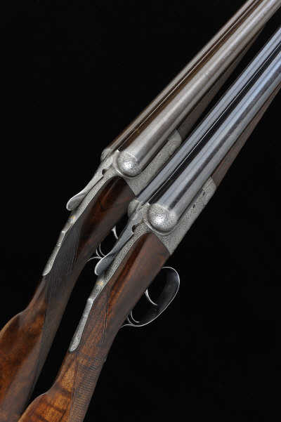 JOHN DICKSON & SON A PAIR OF 12-BORE ROUND ACTION EJECTOR GUNS, NOS. 5392/3 No.1 gun with 28-inch replacement barrels by the maker, with 2 1/2-inch chambers about 1/4 and 1/2 choke borings, the No.2 gun with 29-inch damascus barrels with 2 1/2-inch chambers, about 1/4 and 1/2 choke borings, top extensions, the rounded frames, trigger plates and top levers with foliate scroll engraving, the maker's name signed within a scrolling banner, 14 1/2-inch highly figured stocks, 6lb. 4oz., nitro proof, in their maker's brassbound leather case, No.2 gun left barrel wall thickness below the recommended minimum S2 The maker confirms that the guns were delivered on 2 August 1902. |