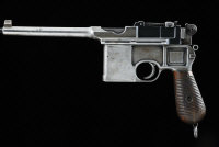 MAUSER A 7.63MM CONE HAMMER BROOM-HANDLE SELF-LOADING PISTOL, NO. 12091 5 1/2-inch barrel, rear sight graduated to 500, ribbed walnut grip, finish worn overall, German nitro proof, in its South African Police leather holster