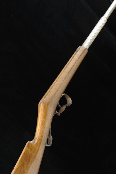 18 1/2-inch nickel plated barrel with ribbed rear portion, twisting and pulling forward to reveal the breech in the manner of a walking stick gun, 13 3/4-inch stock