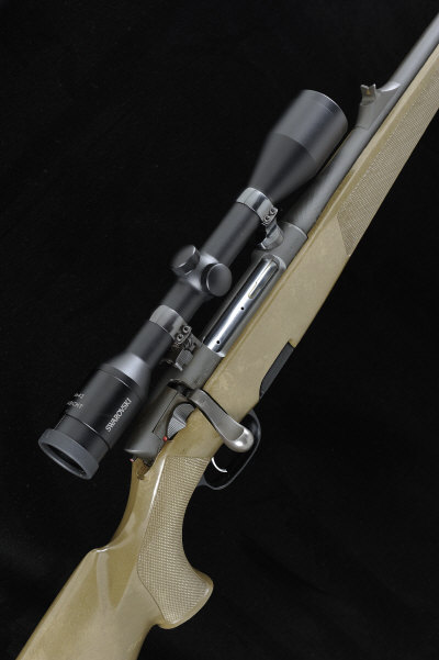 23 1/2-inch barrel threaded for a sound moderator, the receiver mounted with a Swarovski Habicht 6x42 telescopic sight with quick detachable mounts, bolt with side safety, detachable plastic magazine, half length green synthetic stock with pistol grip, cheekpiece and recoil pad, 14 3/4-inch pull, 8lb. 8oz., nitro proof