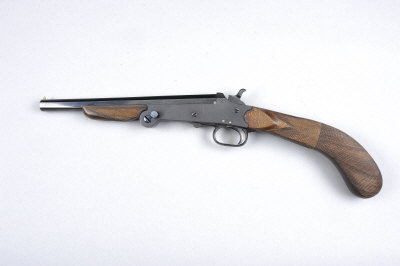 A .410 SHOT PISTOL, NO. 6341, CONVERTED FROM A BELGIAN FOLDING GUN