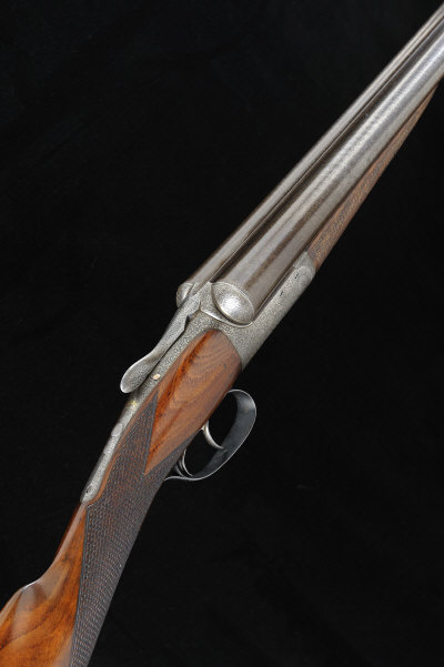 JOHN DICKSON & SON A 12-BORE ROUND ACTION EJECTOR GUN, NO. 4736 29-inch damascus barrels with 2 1/2-inch chambers, about 1/4 and 1/2 choke borings, top extension, the rounded frame, trigger plate and top lever with fine scroll engraving, the maker's name signed within a scrolling banner, gold cocking stud, 14 1/2-inch replacement stock, 6lb. 5oz., nitro proof, in its brassbound leather case with maker's label