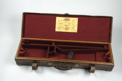 WESTLEY RICHARDS A BRASSBOUND OAK AND LEATHER CASE with lift-out tray for 29-inch barrels, suitable for a hammer gun |