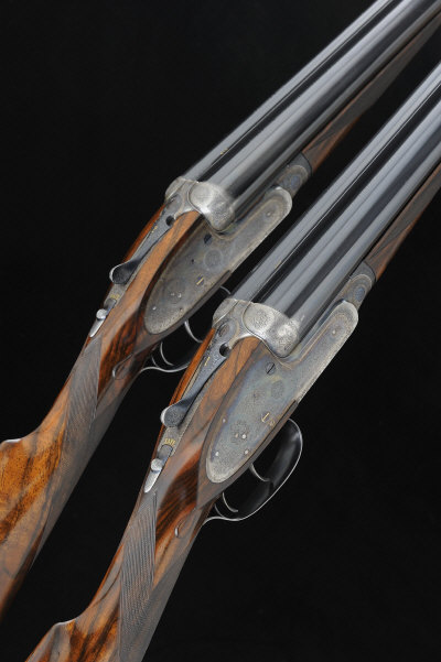 J. PURDEY & SONS A FINE PAIR OF 12-BORE SELF-OPENING SIDELOCK EJECTOR GUNS, NOS. 29307/8 28-inch chopper-lump barrels with 2 3/4-inch chambers, about 1/4 and 1/2 choke borings, the frames, locks and gold numbered top levers with fine bouquet and scroll engraving and retaining much original hardening colour, the trigger plates signed by the engraver "P. M. Frenette", gold lined cocking indicators, 15-inch highly figured exhibition grade stocks, including leather covered recoil pads, 6lb. 14oz., nitro proof, in their maker's brassbound oak and leather case, with canvas outer cover S2 The maker confirms that the guns were completed in 1993. The current replacement cost is in excess of £330,000 including VAT. |