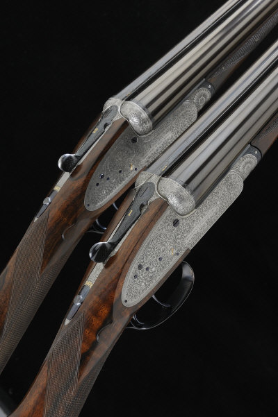 HOLLAND & HOLLAND A PAIR OF 12-BORE "ROYAL" MODEL SIDELOCK EJECTOR GUNS, NOS. 25368/9 28-inch replacement barrels by the maker with 2 3/4-inch chambers, about 5/8 choke borings, the frames, locks and gold numbered top levers with fine acanthus scroll engraving, gold numbered top levers, gold lined cocking indicators, articulated front triggers, 15 3/4-inch highly figured replacement stocks, 6lb. 12oz, nitro proof, in their maker's brassbound oak and leather case S2 The maker confirms that the guns were built in 1908 as a pair of 12-bore single trigger guns. The replacement barrels were fitted in 1998 by Holland & Holland who sold the guns to the present owner. They have subsequently been re-stocked and converted to double trigger by Michael Rainback. |
