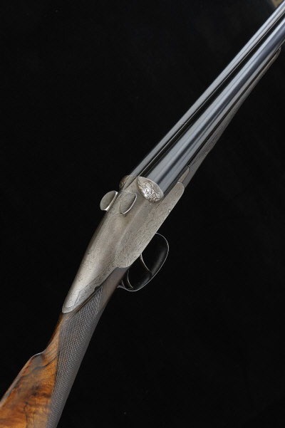 27-inch sleeved barrels with 2 3/4-inch chambers, about 1/4 and full choke borings, the frame and sliding breech engraved with scenes of dogs and deer, the fences carved with foliage, side safety, 14-inch highly figured stock with ribbed butt plate, 5lb. 14oz., nitro proof