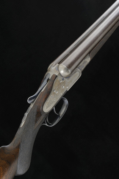 30-inch damascus barrels with 2 1/2-inch chambers, about true cylinder and 3/4 choke borings, machined rib with doll's head extension, the frame, back action bar locks and top lever engraved with game vignettes surrounded by scrollwork, the maker's name signed within a scrolling banner and retaining traces of renewed hardening colour, 14 1/4-inch stock with semi pistol grip and ribbed butt plate, 6lb. 14oz., nitro re-proof, leather leg-of-mutton case