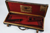 A 12-BORE BRASSBOUND OAK AND LEATHER DOUBLE GUN CASE