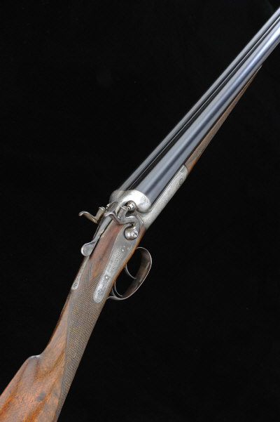 ARMY & NAVY C.S.L. A 20-BORE TOP LEVER HAMMER GUN, NO. 44392 28-inch barrels with 2 1/2-inch chambers about 1/4 and 1/2 choke borings, the rounded frame, rebounding backlocks, hammers and top lever with border and scroll engraving, and retaining traces of original hardening colour, 14 3/4-inch figured stock including 1 3/4-inch extension, 5lb. 3oz., nitro proof |
