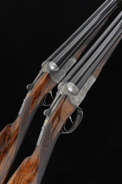 DANIEL FRASER A FINE PAIR OF 12-BORE BOXLOCK EJECTOR GUNS, NOS. 2886/7 30-inch chopper-lump barrels with 2 1/2-inch chambers, about 1/4 and 3/4 choke borings, top extensions, the ribs signed by the maker and with a lightly stippled finish, the characteristically shaped frames and gold numbered top levers with fine scroll engraving, strapwork borders and retaining traces of original hardening colour, the maker's name signed within a scrolling banner, 14 1/2-inch highly figured stocks with chequered butt plates, 6lb. 8oz., nitro re-proof, barrel wall thickness below the recommended minimum S2 The guns are of exceptional quality, typical of this maker. |