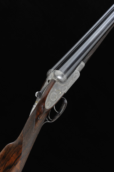 29-inch barrels with 2 1/2-inch chambers, about improved cylinder borings, the frame, locks and top lever with fine bouquet and scroll engraving, the maker's name signed within a scrolling banner, gold lined cocking indicators, 14 1/4-inch well figured stock, 6lb. 8oz., nitro proof, bores marked