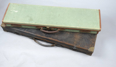 A BRASSBOUND OAK AND LEATHER DOUBLE GUN CASE with compartments blocked for 28-inch barrels; together with a canvas Brady gun case; and an alloy flight case (3) |