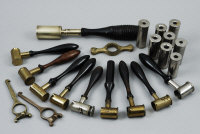 A GROUP OF GUNMAKERS ACCESSSORIES comprising: 8 named snap caps, 9 various shot and powder measures, 2 cartridge extractors, one cartridge sizer, a chamber brush and pull-through |