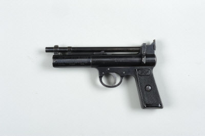 WEBLEY & SCOTT A .22 "SENIOR" MODEL AIR PISTOL, NO. S4882, PRE-WAR MODEL 7-inch barrel with stirrup catch, the frame with straight grip and impressed patent dates, chequered composition grips, retaining much original finish overall |