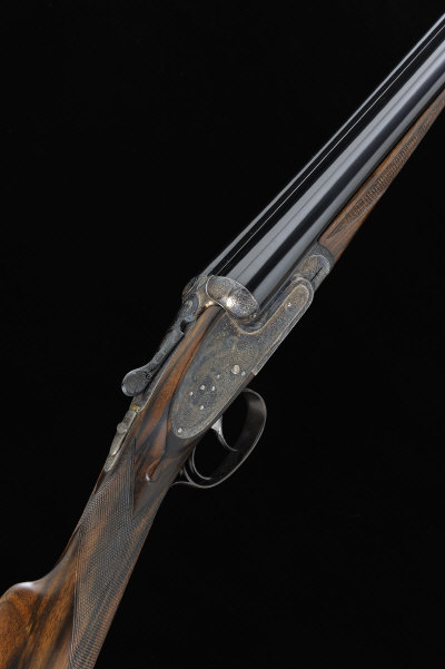 32-inch sleeved barrels with 2 3/4-inch chambers, about full choke borings, the frame, hand detachable locks and top lever with fine bouquet and scroll engraving and retaining virtually all of its original hardening colour, gold lined cocking indicators, articulated front trigger, rolled edge trigger guard, 14 3/4-inch well figured stock, 6lb 10oz,, nitro re-proof