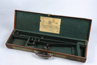 with compartment for 30-inch barrels, exterior worn, leather patches applied to each end