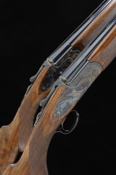 RIZZINI A PAIR OF 12-BORE "ARTEMIS CLASSIC" MODEL SINGLE TRIGGER OVER AND UNDER EJECTOR GUNS, NOS. 28940/1 28-inch monobloc barrels with 2 3/4-inch chambers, about 1/4 and 1/2 choke borings, machined ventilated ribs, the frames, side plates and top levers with stippled top surfaces and retaining virtually all of their original hardening colour, selective single triggers, non-automatic safeties, 14 3/4-inch well figured stocks with semi pistol grips, 7lb. 2oz., Italian nitro proof, in their maker's plastic case S2 |